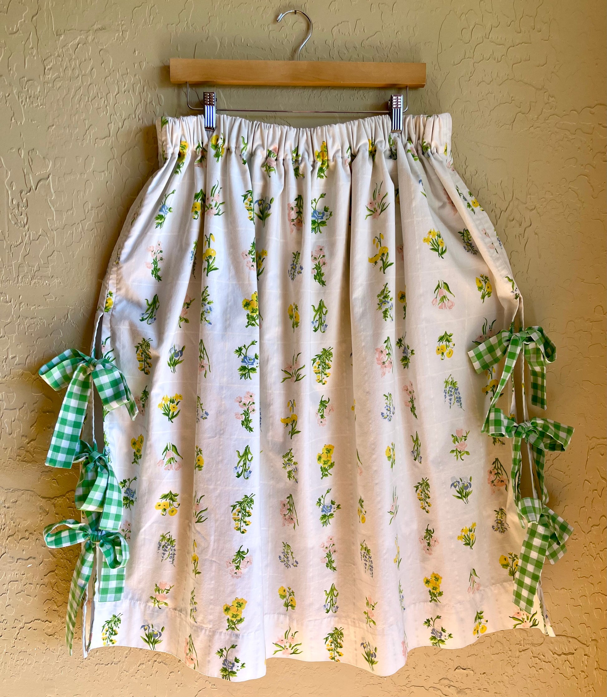 Gathered midi length skirt with an elastic waistband and flirty side ties in a sweet, floral "Ditsy Bouquet" print. Ethically handmade from vintage bedsheets, making for super comfy wear and easy washing. Fully lined and opaque