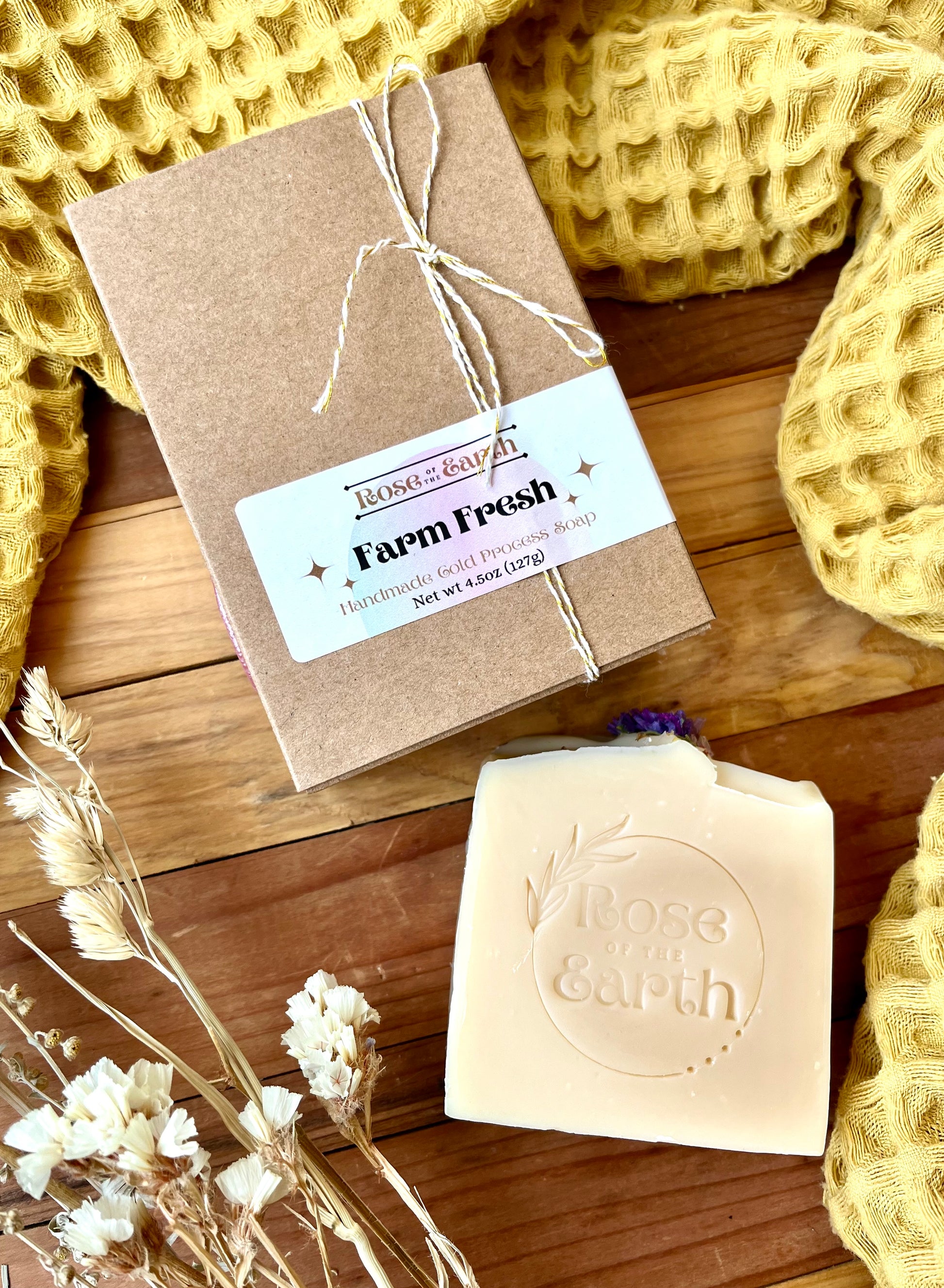 Pure, simple, and elegant, Farm Fresh is a luxurious and creamy soap for even the most delicate skin. This soap is fragrance free but has a mild hint of cocoa butter, and features calming chamomile extract as well as raw milk and dried flowers from local Full Bushel Farm.