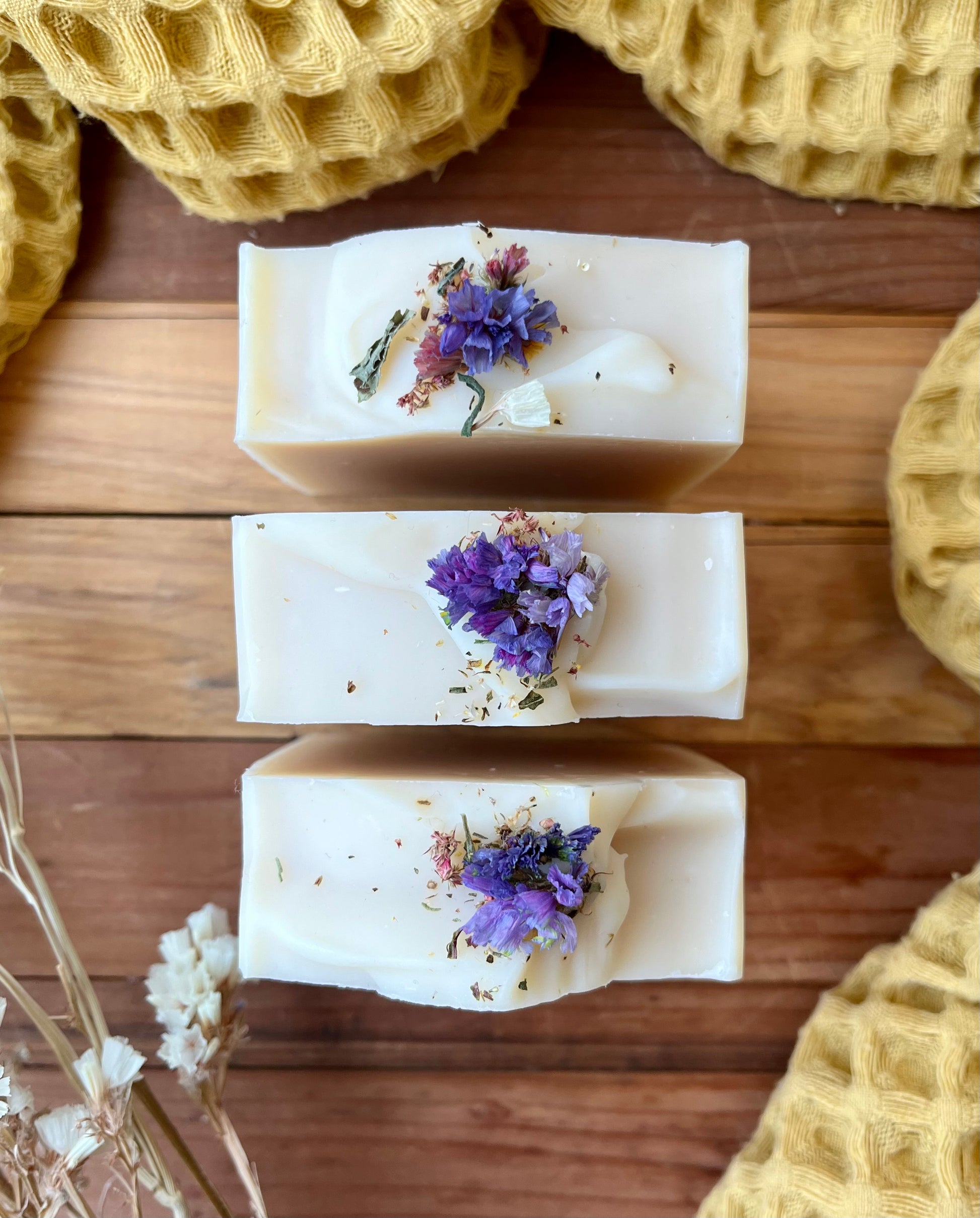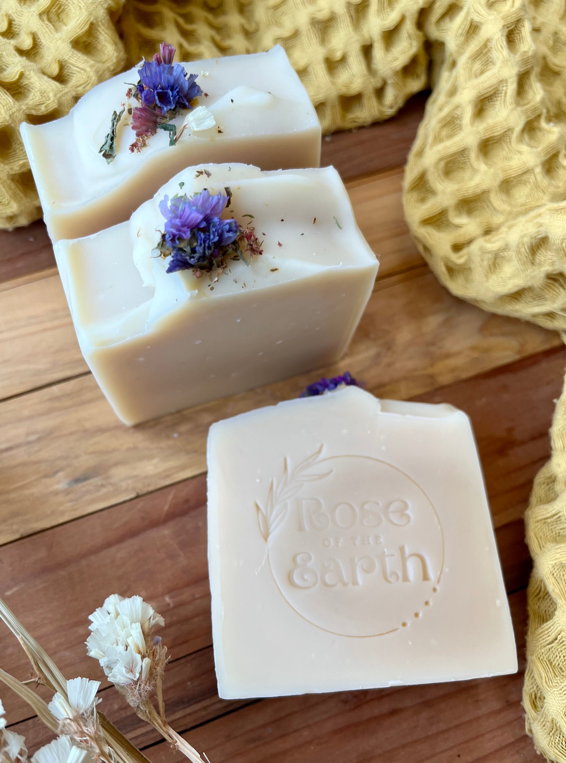 Ingredients: Olive oil, coconut oil, raw milk, distilled water, shea butter, sodium hydroxide, cocoa butter, castor oil, chamomile extract, dried mixed flowers