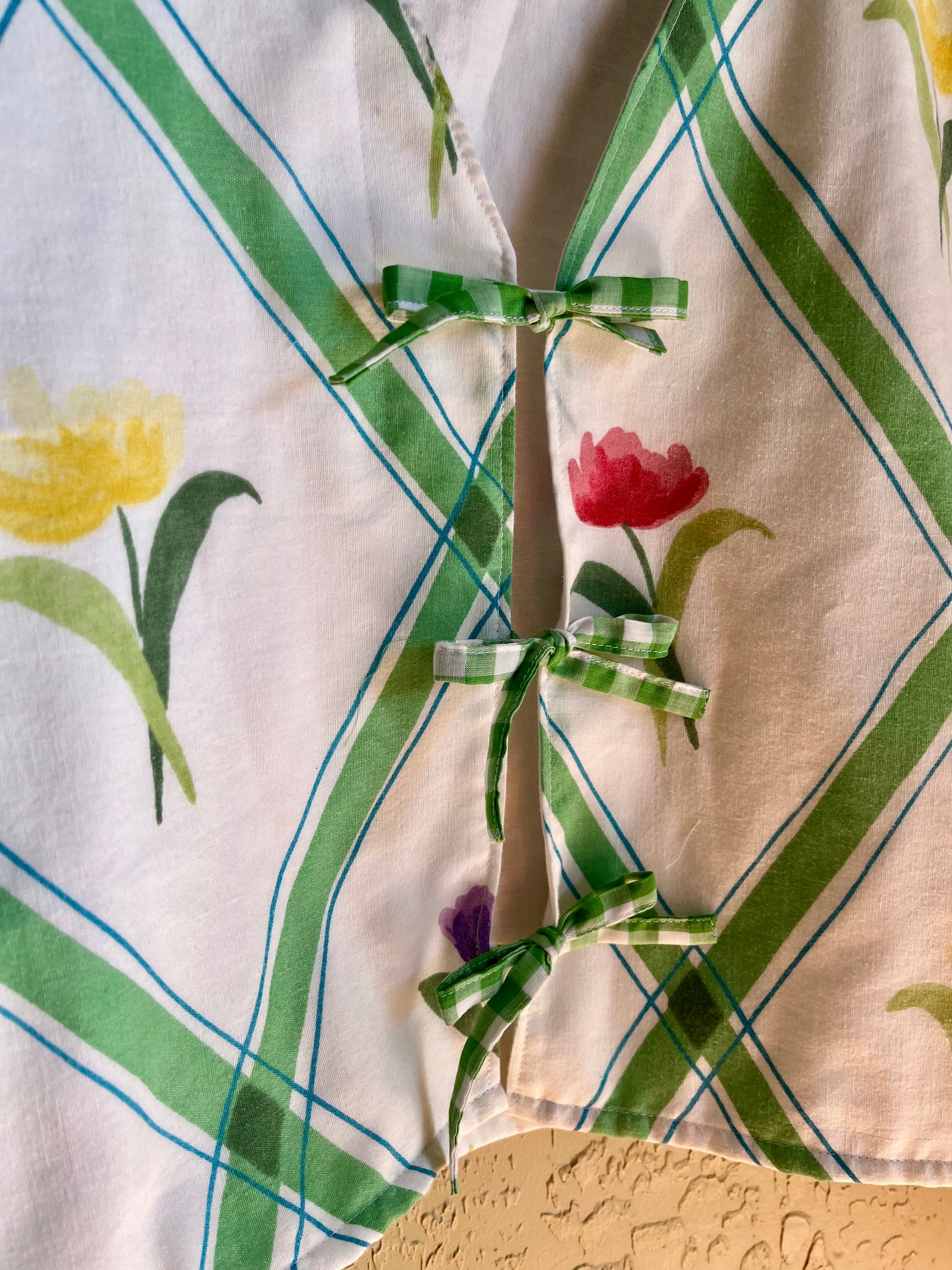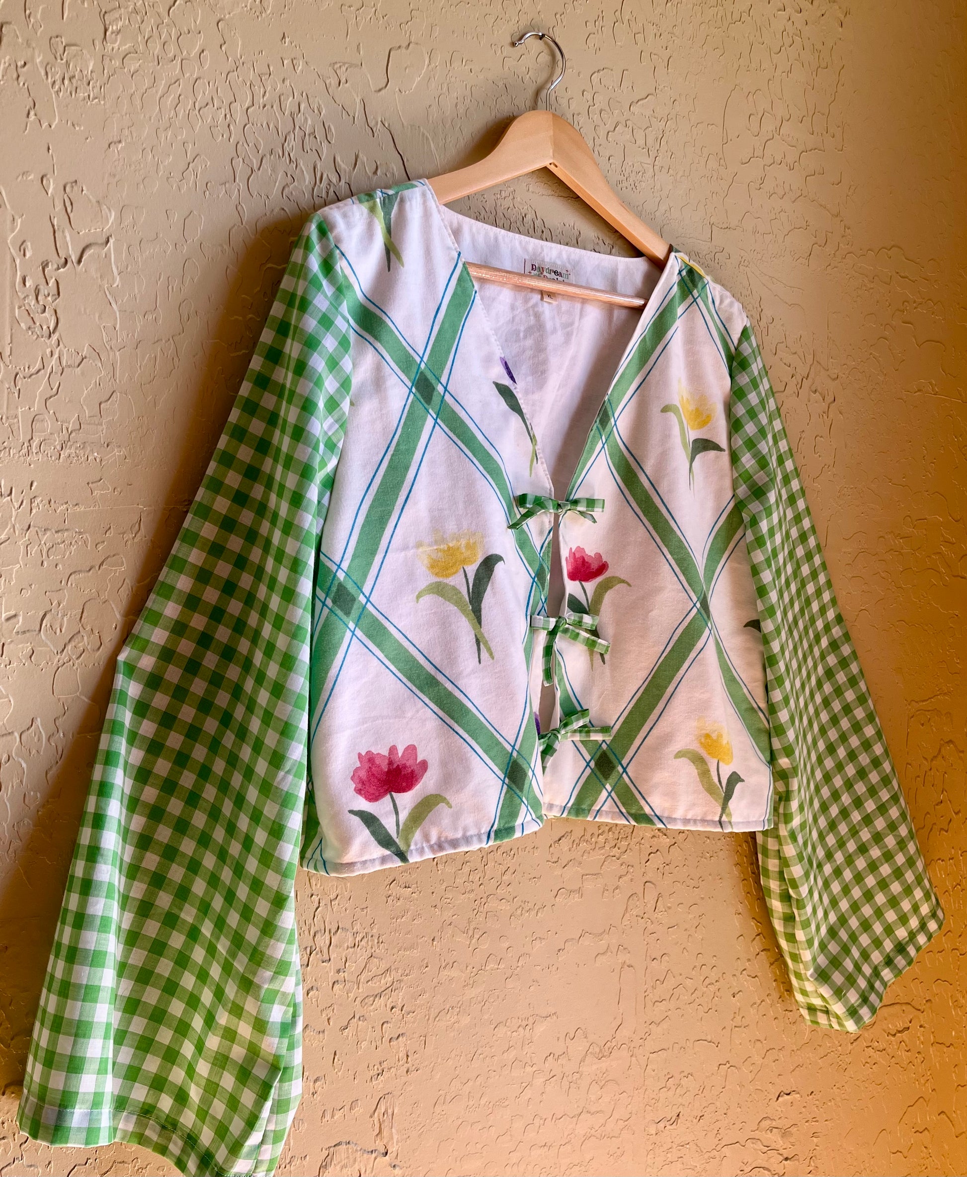 Sweet and elegant top in an argyle tulip print with green gingham bell sleeves and tie front detail. Bodice is lined for comfort and opacity. Ethically handmade from vintage bedsheets, making for super comfy wear and easy washing.