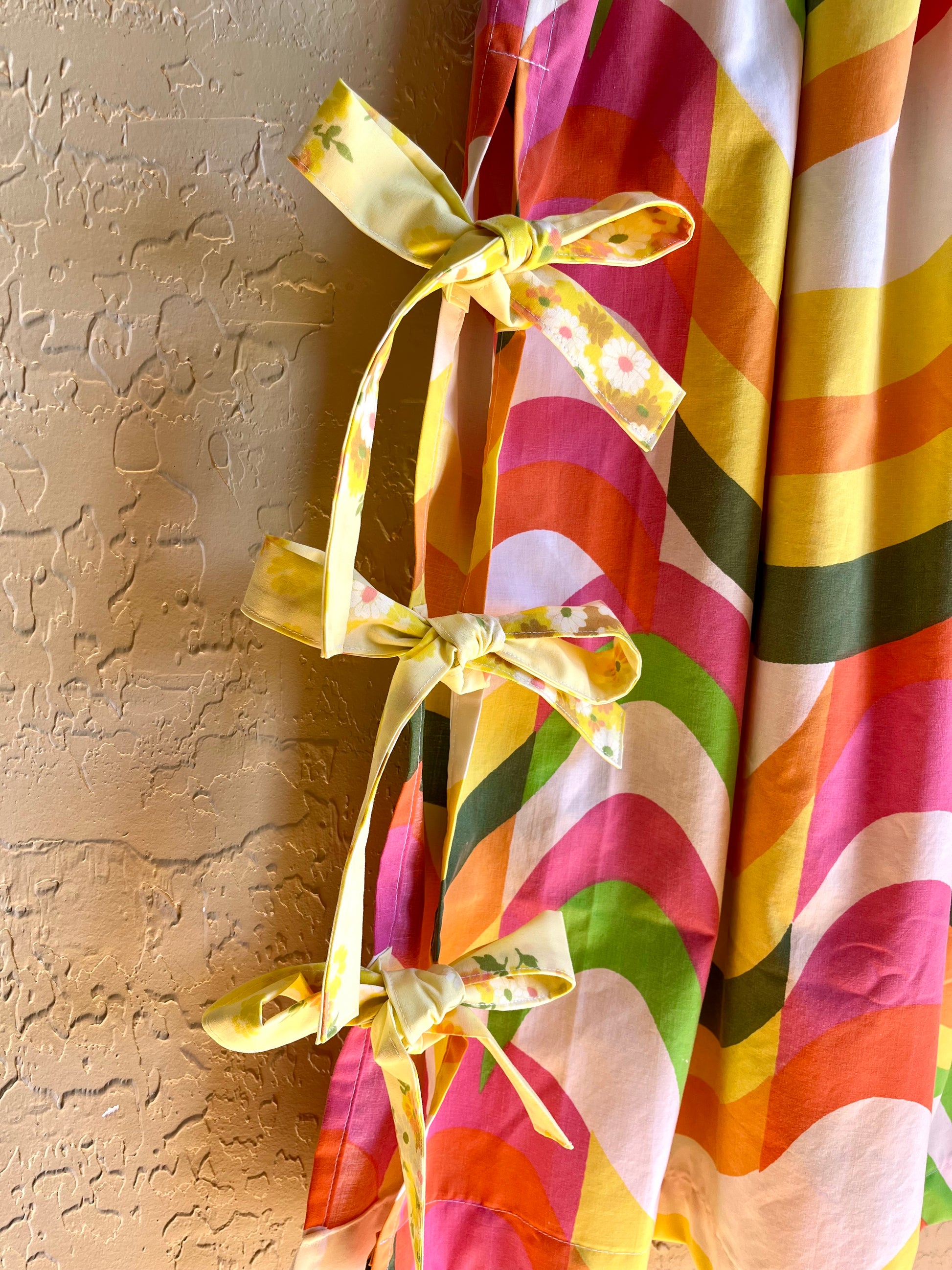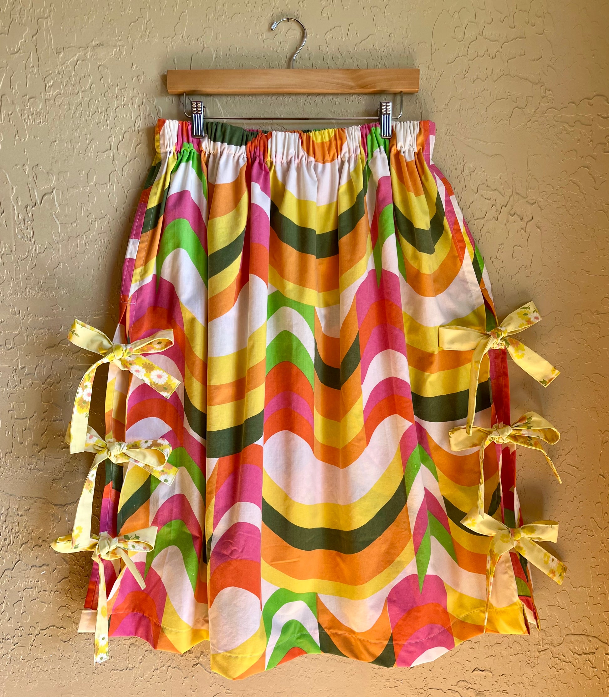 Gathered midi length skirt with an elastic waistband and flirty side ties in a mod, vintage "Groove" print. Ethically handmade from vintage bedsheets, making for super comfy wear and easy washing.