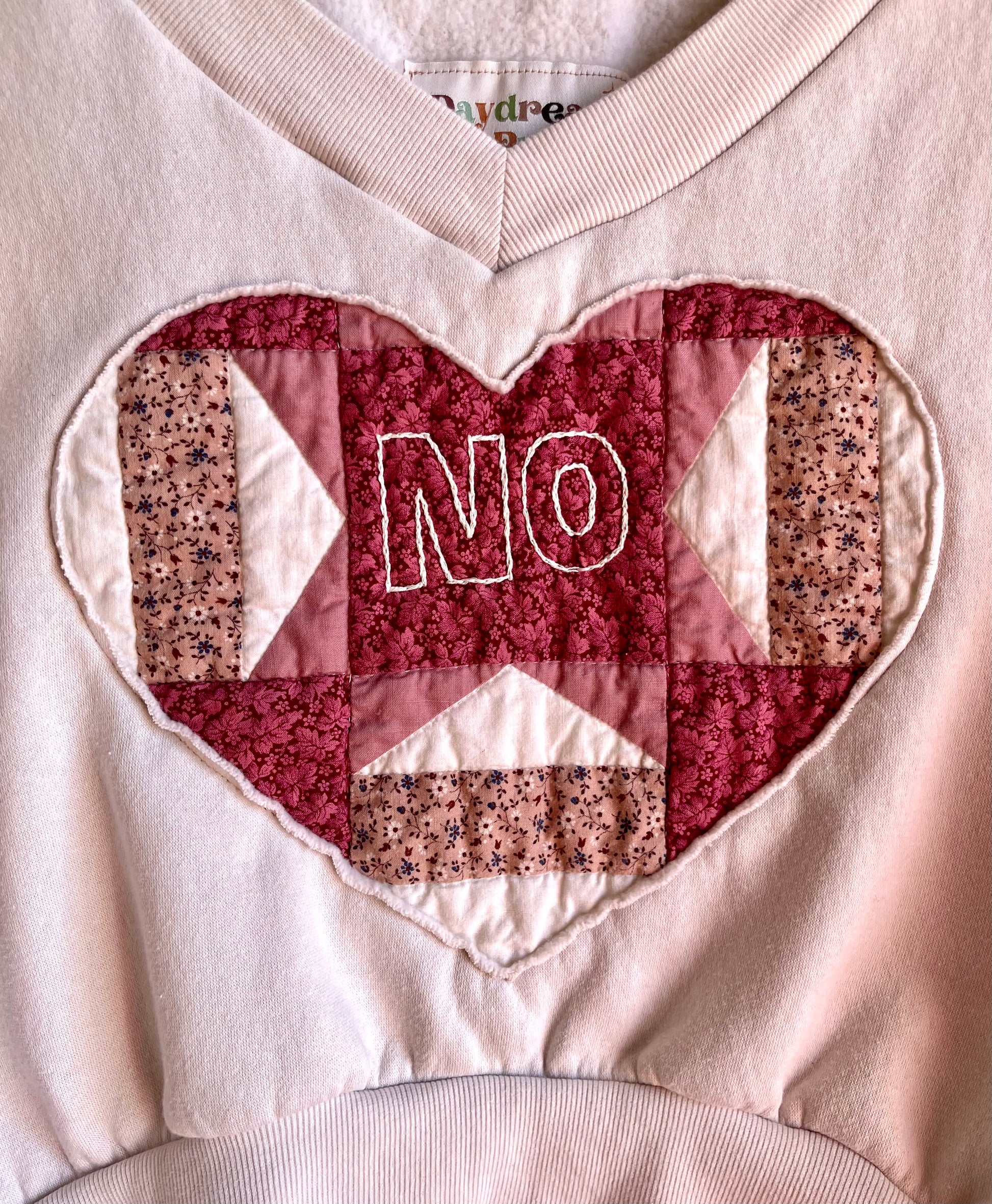 This cute and cheeky sweater features a hand embroidered “NO” on a quilted conversation heart reverse appliquéd onto a super soft and plush cream colored sweatshirt. The sweatshirt itself features a v neck and cropped fit, and is made of a cozy cotton/poly blend.