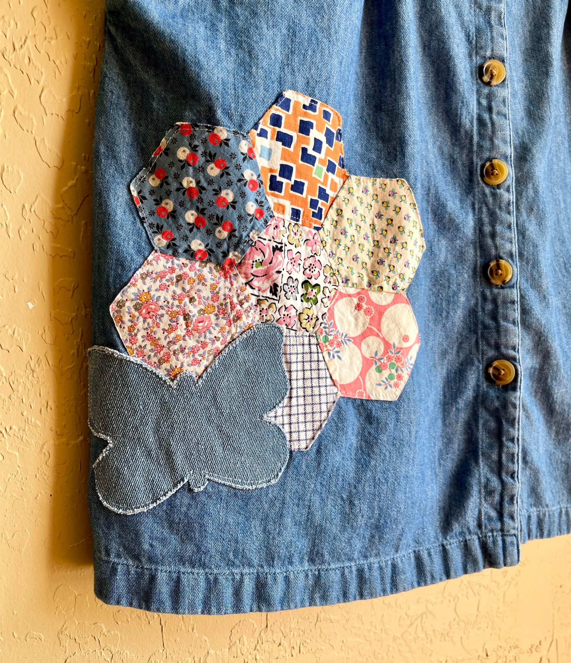 Cute and flirty lightweight denim mini, this dress has been reworked to include vintage quilt blocks and denim applique butterflies.