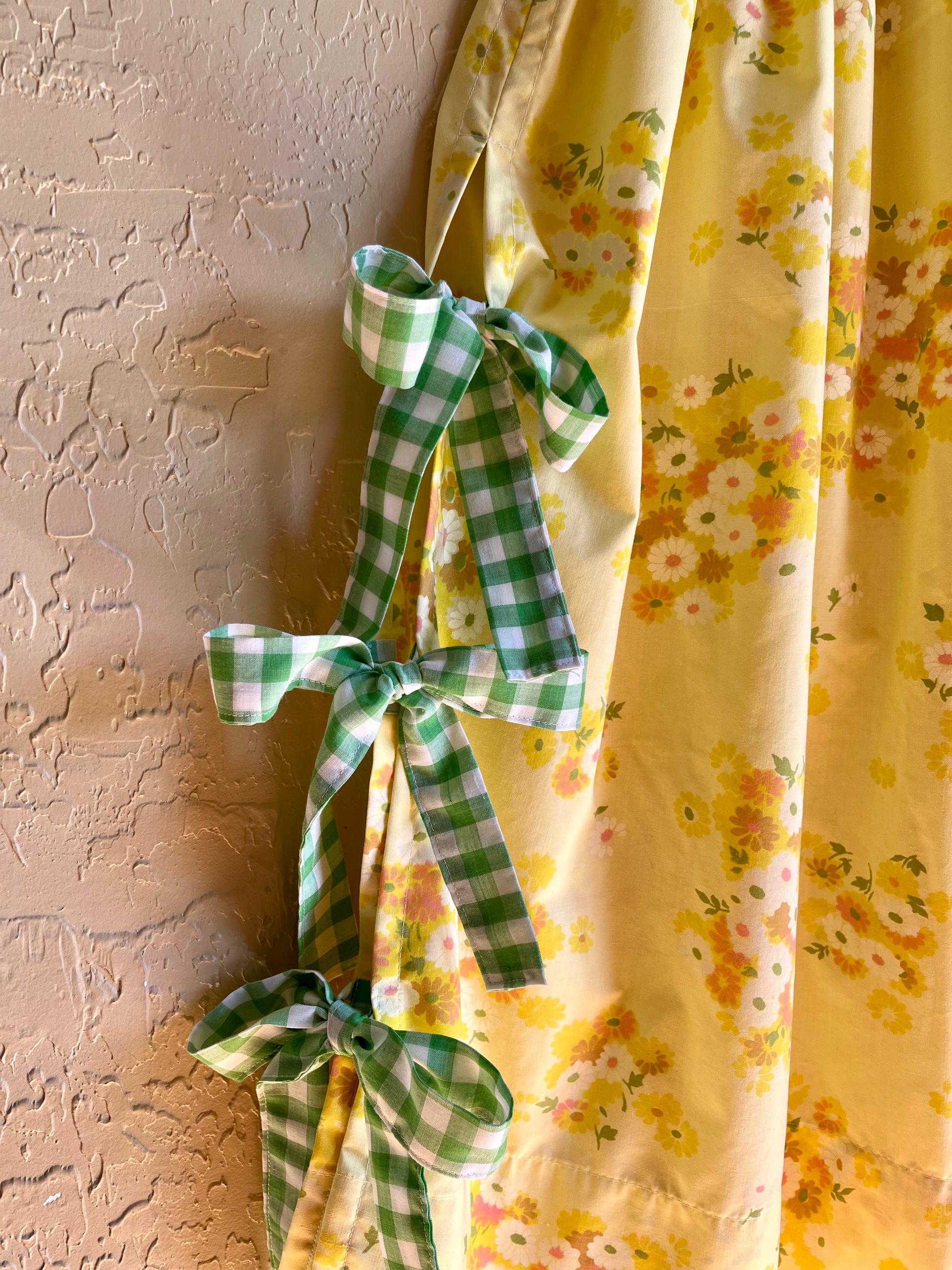 Gathered midi length skirt with an elastic waistband and flirty side ties in a vintage, flower power vibe "Retro Daisy" print. Ethically handmade from vintage bedsheets, making for super comfy wear and easy washing.