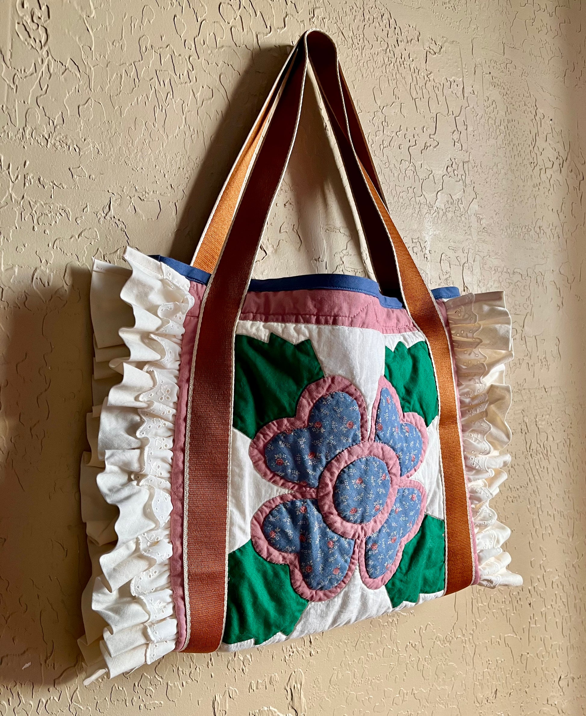 This one of a kind tote bag is a piece of wearable art! It features blocks from a gorgeous reclaimed vintage quilt, including a hand appliquéd floral design, and dramatic double ruffled edges. Accented with sturdy nylon web straps in a soft brown, with denim blue bias bound edging. The details continue on the inside of the bag, with a functional quilt block pocket, and all seams bound with floral bias binding for a clean finish. This bag is every bit as functional as it is lovely, with plenty of room to carry all your belongings, without being too big to be practical. It is the perfect everyday tote and is just waiting to be your new statement piece:)