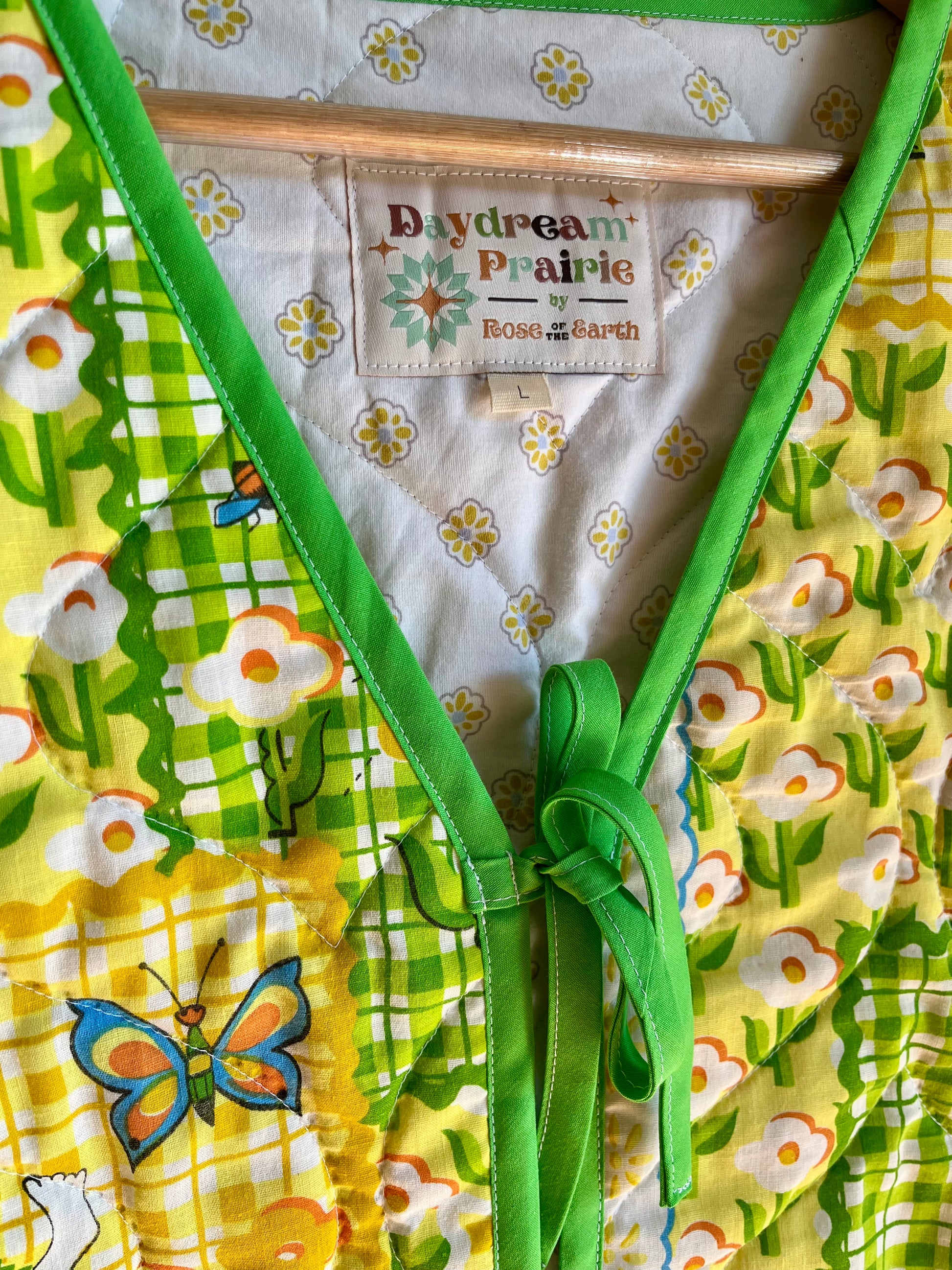 Full of charm and perfect for layering, this tie front vest is made from a quirky vintage bedspread that has been rescued and re-quilted. Featuring a playful "Silly Goose" print that is sure to be the most fun piece in your closet!